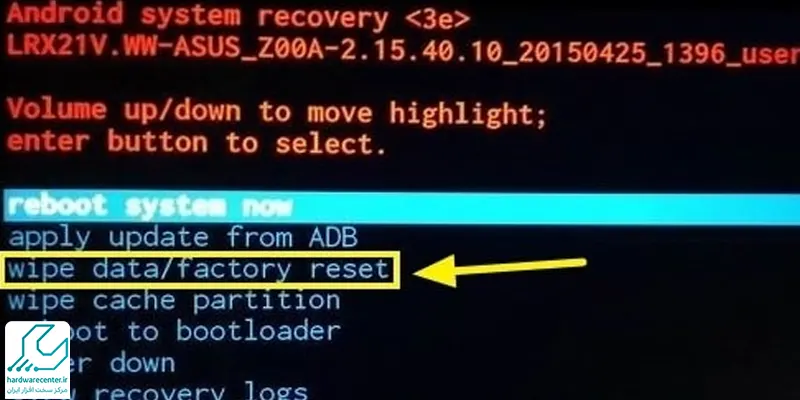 • روی گزینه wipe data/factory rese رفته و با دکمه Home آن را انتخاب کنید.